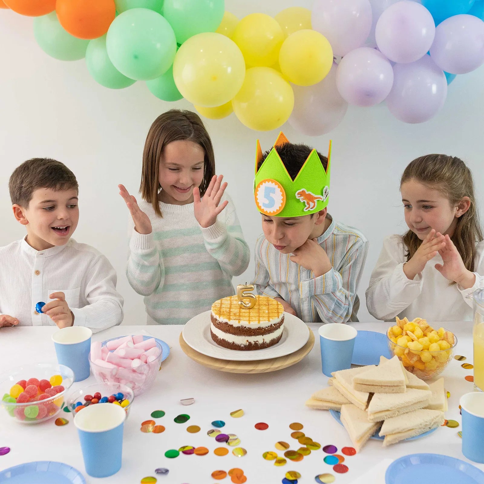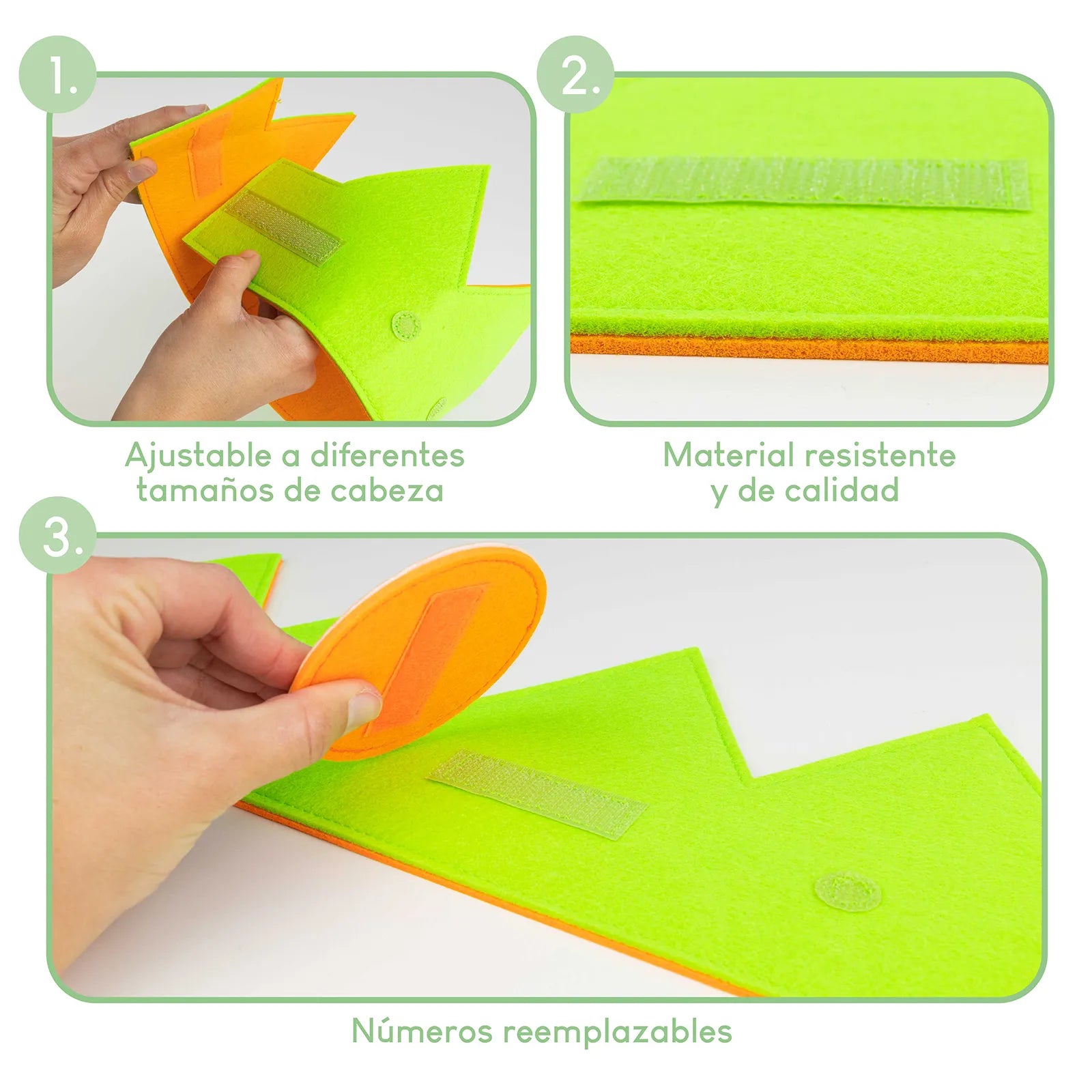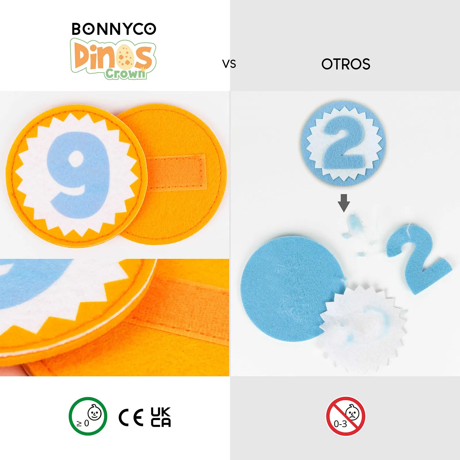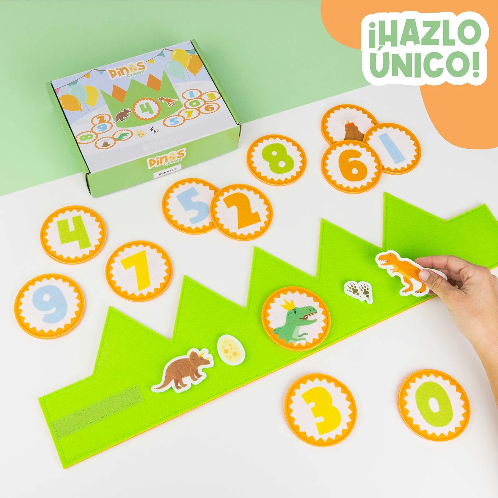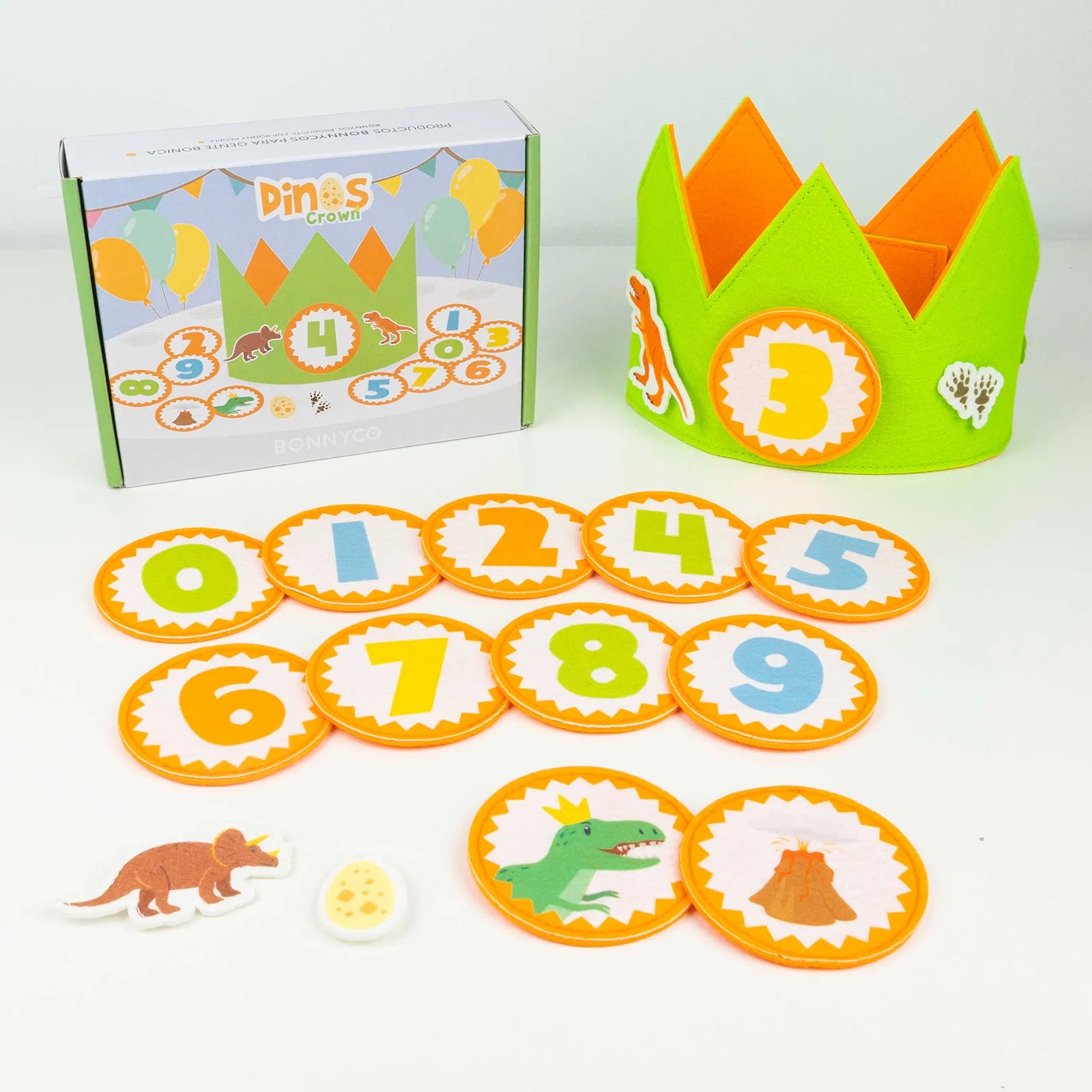 - 4 Figuras tematizadas: incluye figuras de 2 dinosaurios, 1 huevo de dinosaurio, y 1 huellas de dinosaurio. Los niños podrán colocar las figuras a su gusto en cualquiera de los cuatro puntos de fieltro en la corona. Sin duda, ideal para fomentar la creatividad y la expectación antes de su fiesta tan especial.