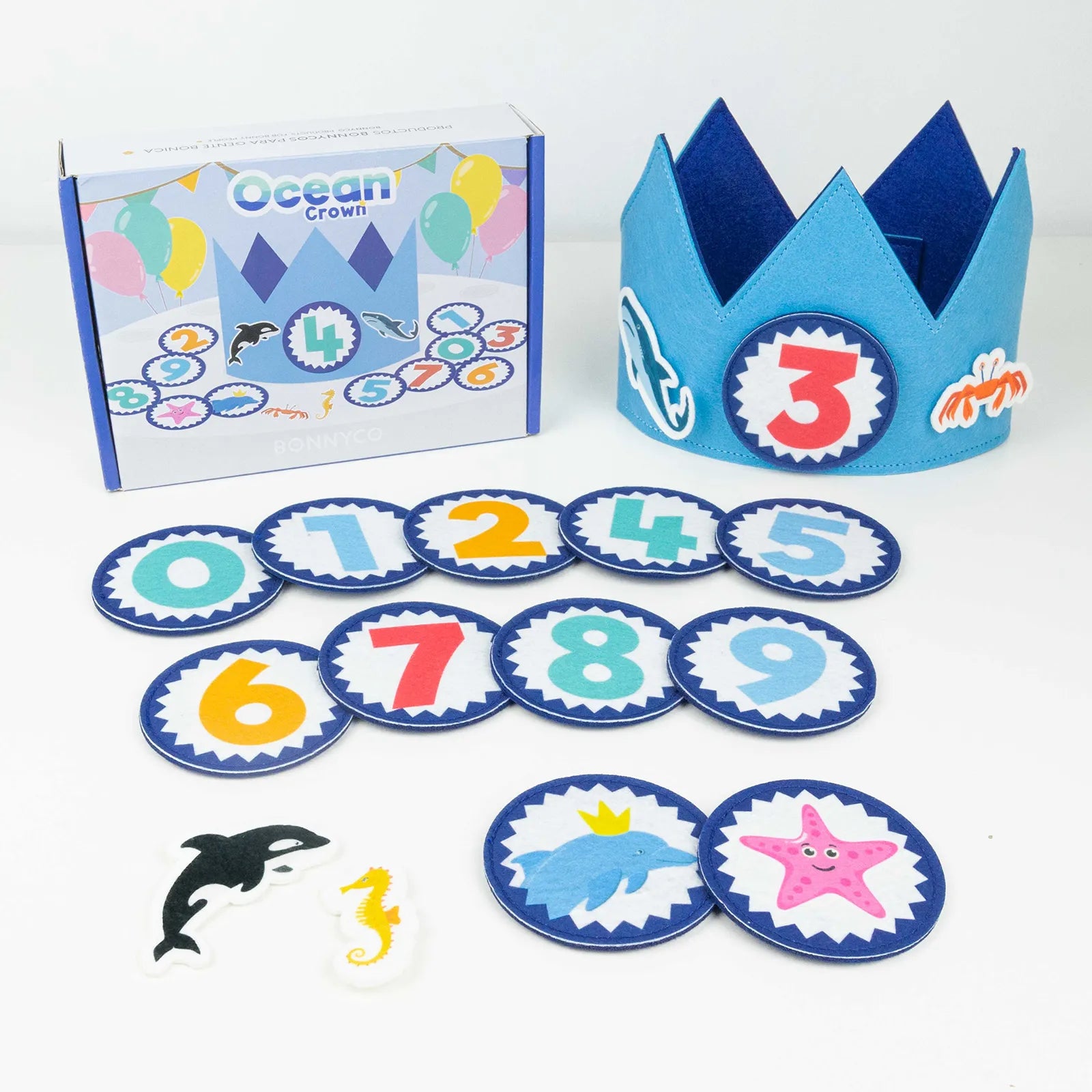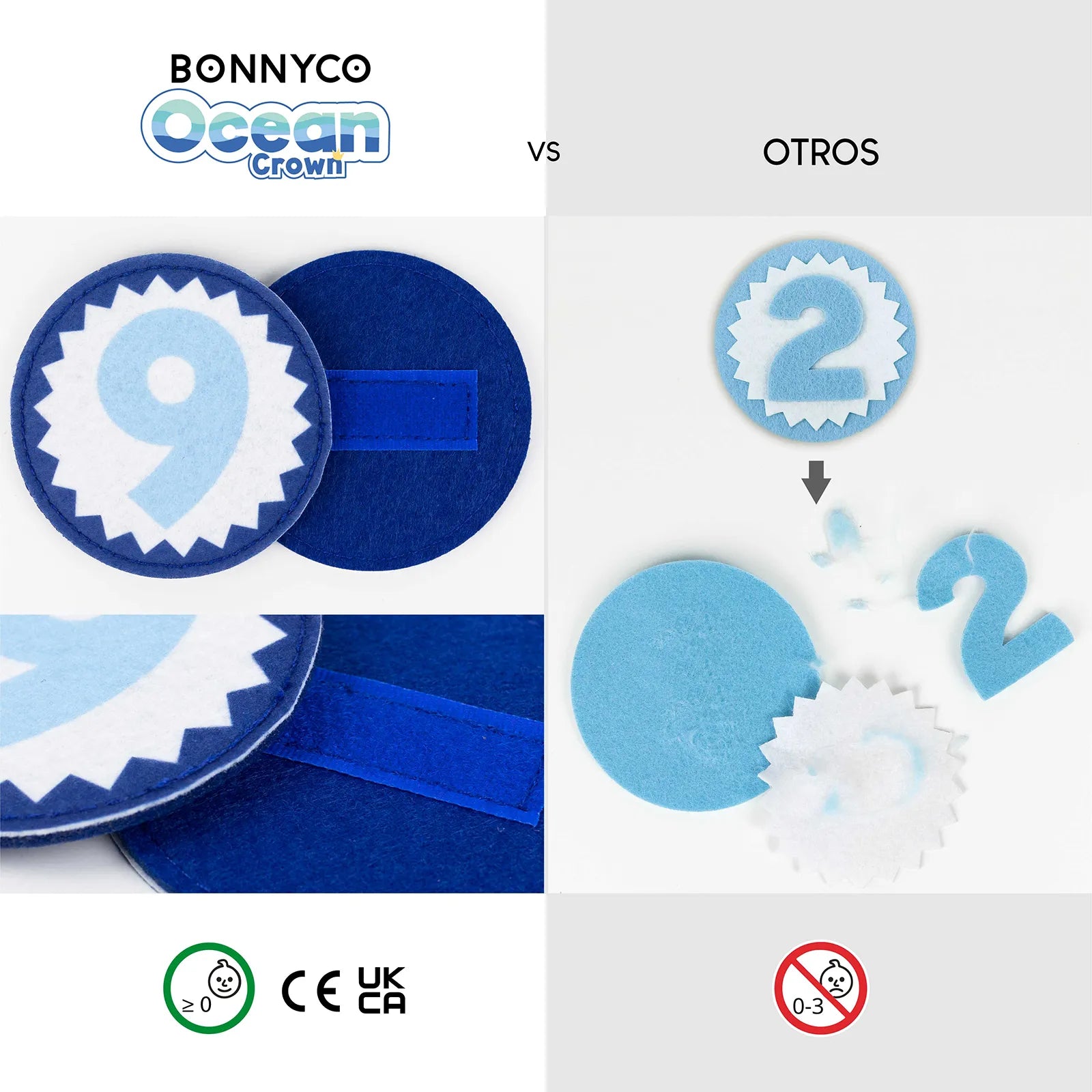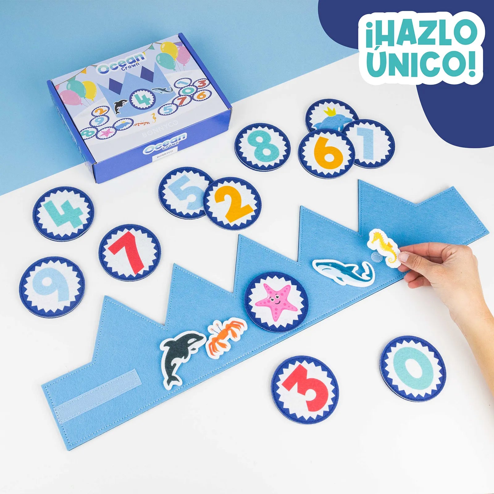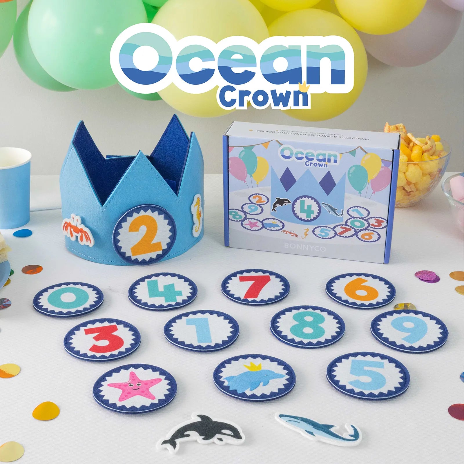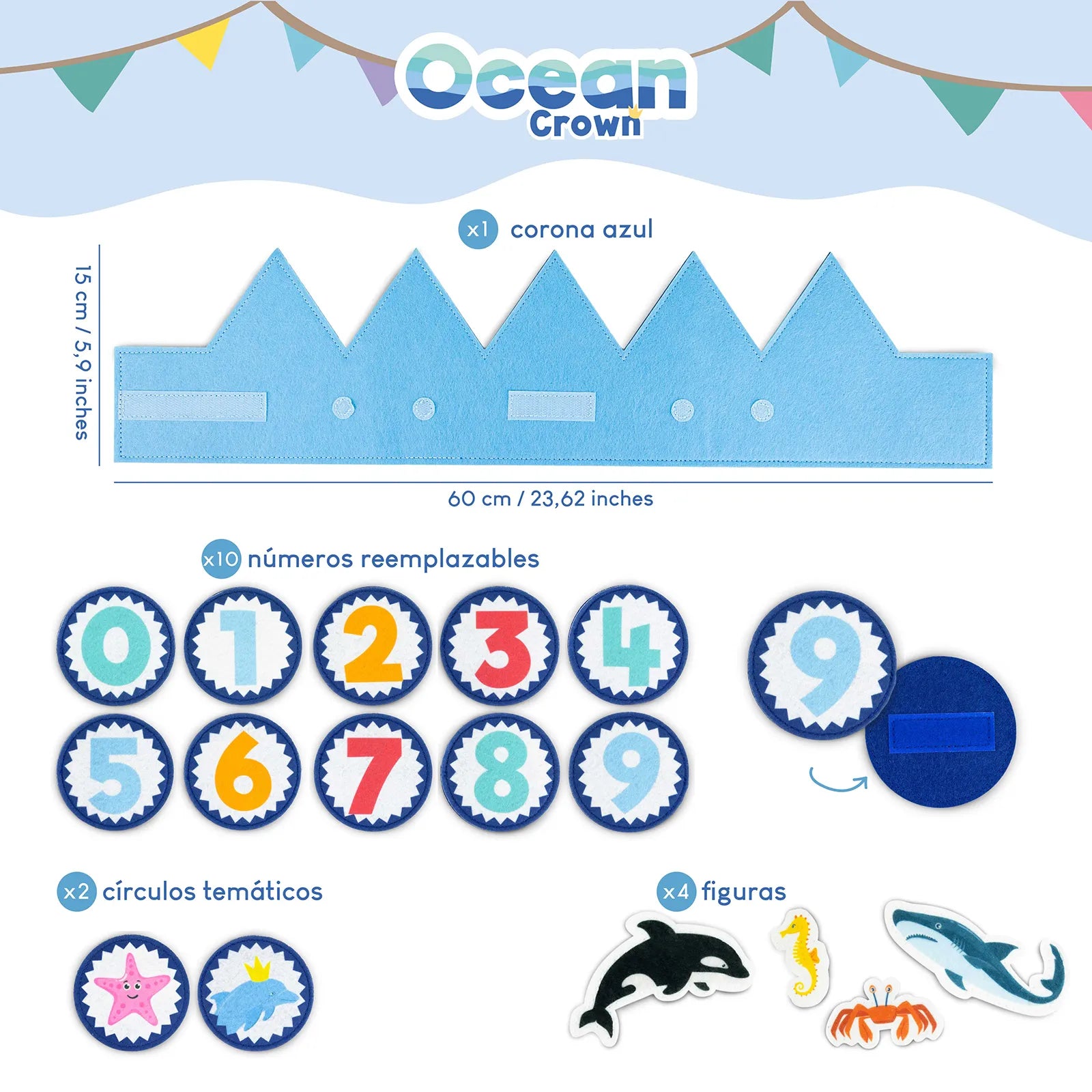 - 4 Figuras tematizadas: incluye figuras de 1 tiburón, 1 orca, 1 caballito de mar y 1 cangrejo. Los niños podrán colocar las figuras a su gusto en cualquiera de los cuatro puntos de fieltro en la corona. Sin duda, ideal para fomentar la creatividad y la expectación antes de su fiesta tan especial.
