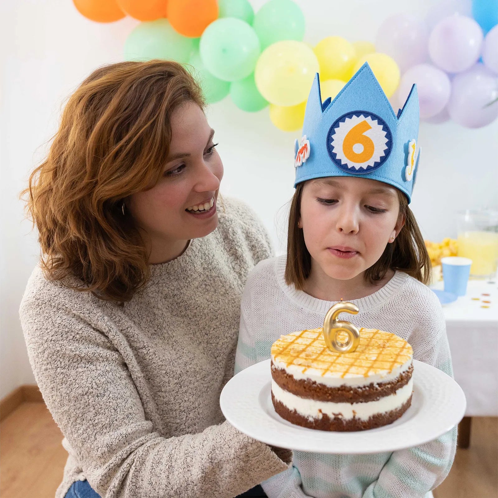 La corona de cumpleaños de fieltro se puede personalizar gracias a los números, los círculos y las figuras tematizadas. Los niños podrán pegar cada uno de los accesorios en la corona gracias al velcro, creando diseños únicos y personalizados para su fiesta. Su diseño resistente hará que puedas utilizar la corona en más de un evento y los números incluidos harán que valga para otros cumpleaños.