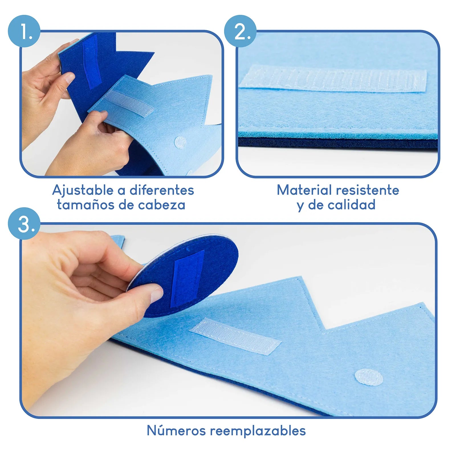 - 1 Corona de cumpleaños: está fabricada con fieltro de alta calidad y muy resistente. Mide 60 cm por lo que se puede colocar en cabecitas de mayor diámetro. Tiene doble capa de un total de 4 mm, la capa delantera es de color azul claro y la trasera de color azul oscuro.