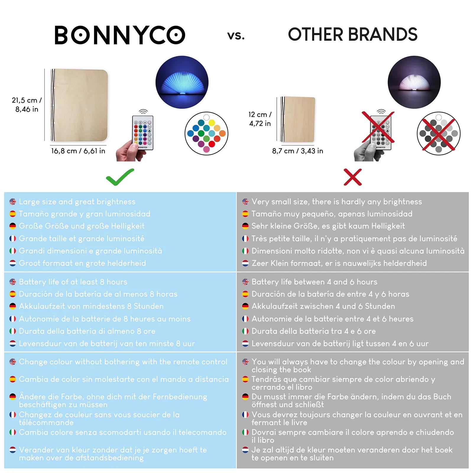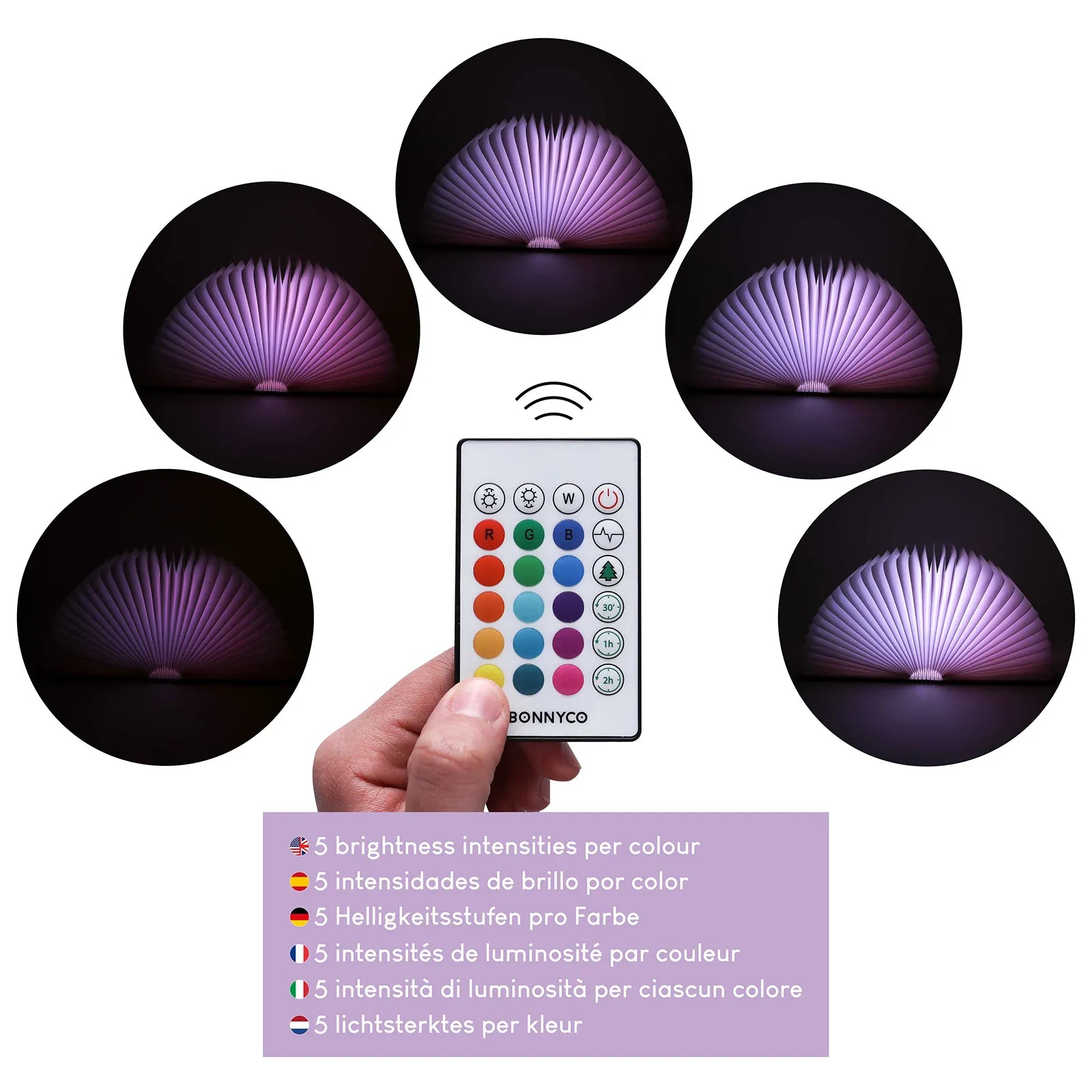 Nuestra lámpara de libro tiene un funcionamiento sencillo e intuitivo. Ábrela para conectar la luz y ciérrala para apagarla o cambiar la luz de color. El mando permite elegir entre los 16 colores diferentes, ajustar la intensidad de la luz y seleccionar los diferentes programas incluidos. Su diseño robusto y flexible permite adoptar diferentes posiciones, con hasta 360 grados de abertura. Una vez plegado, puedes guardarlo como un libro más en una estantería o en un cajón. O dejarlo como parte de la decoración de una habitación.