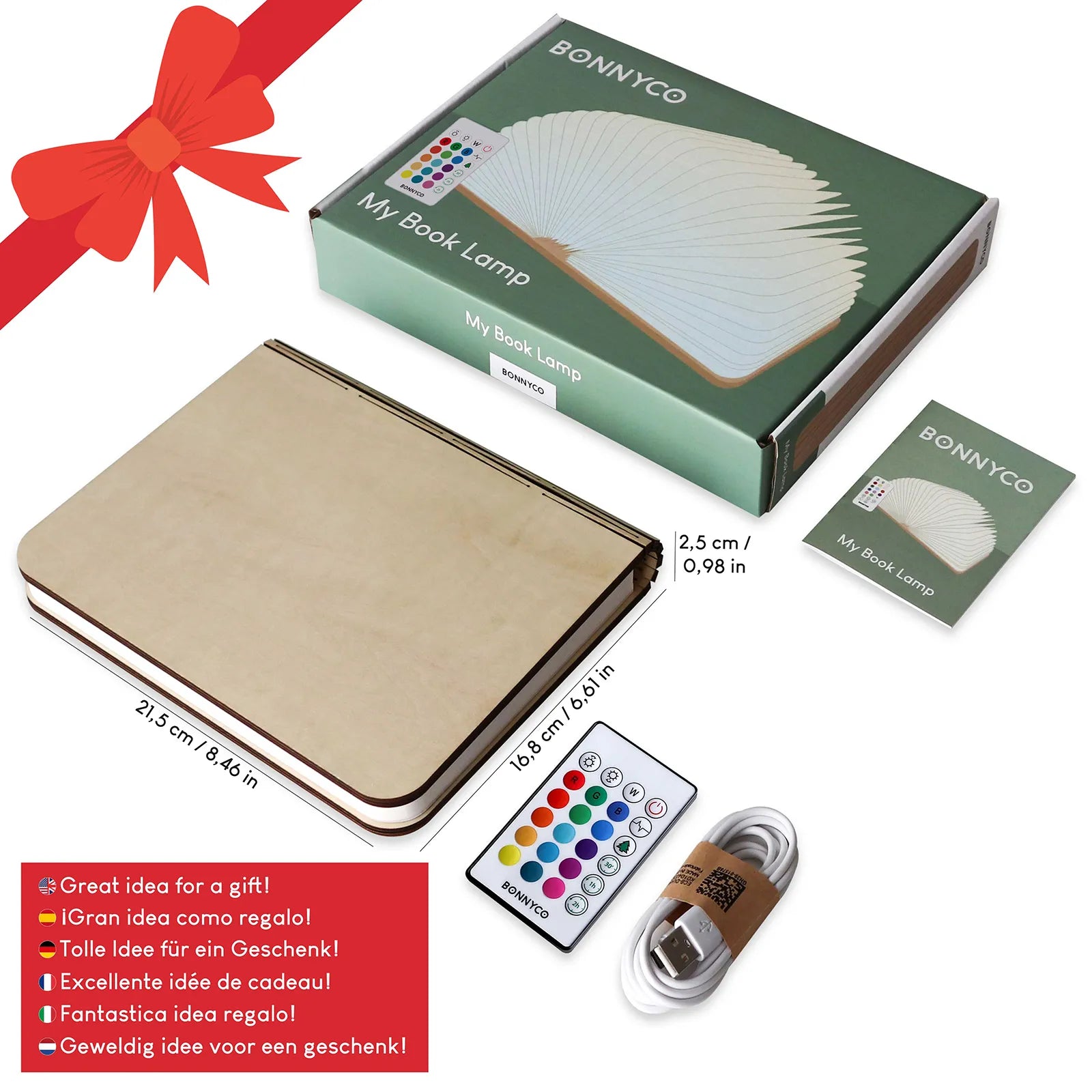 - Lámpara de libro LED: lámpara con cubierta de madera de arce de gran calidad y con cierre imantado que permite adoptar una forma de hasta 360º. En el interior lleva incorporadas 36 hojas de papel de pergamino de alta resistencia y durabilidad, por lo que no se arrugan con facilidad. El libro cambia de color al abrirse y cerrarse.