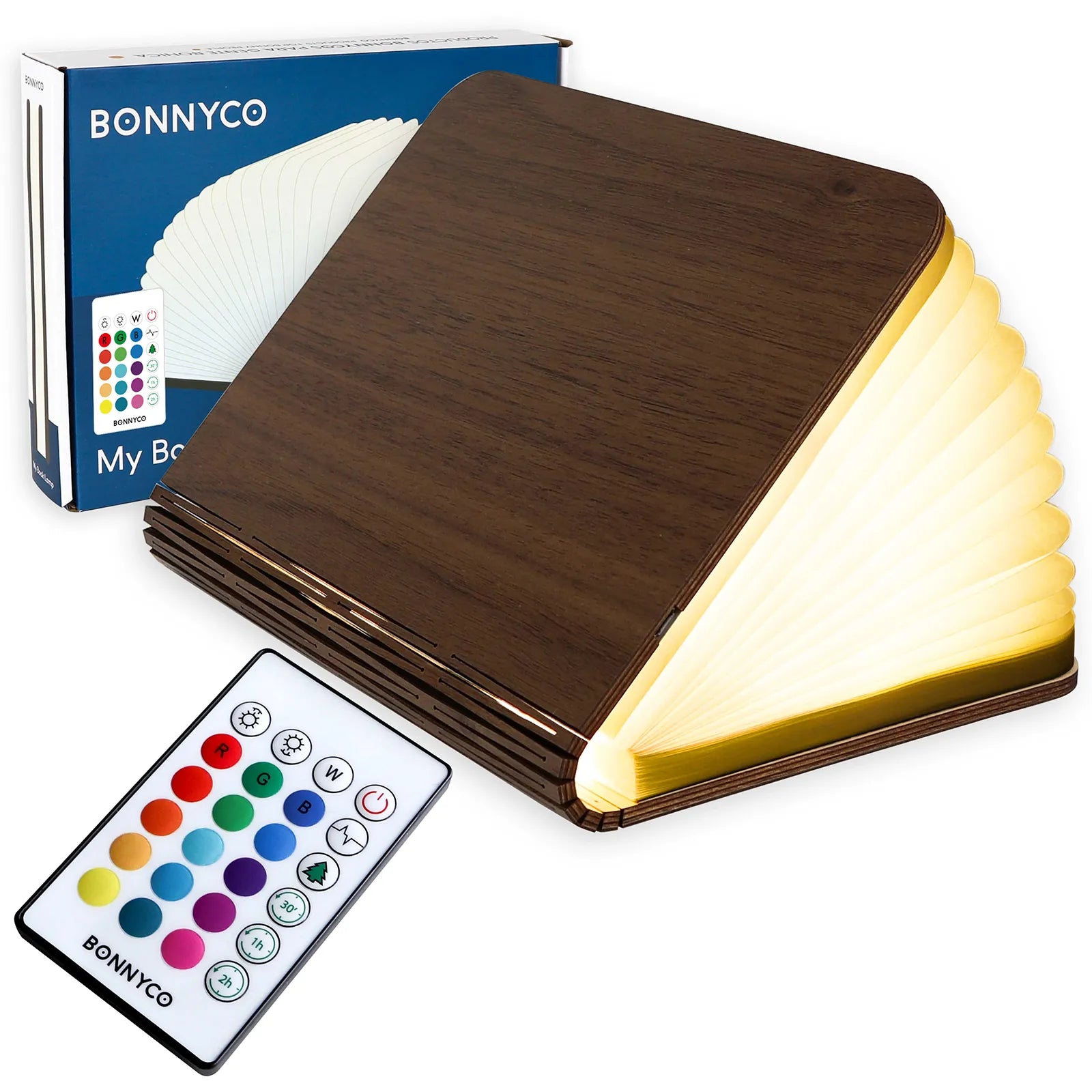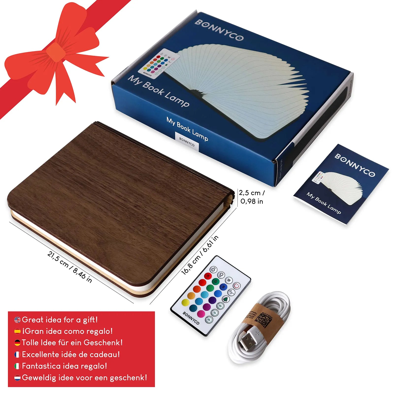 - Lámpara de libro LED: lámpara con cubierta de madera de nogal de gran calidad y con cierre imantado que permite adoptar una forma de hasta 360º. En el interior lleva incorporadas 36 hojas de papel de pergamino de alta resistencia y durabilidad, por lo que no se arrugan con facilidad. El libro cambia de color al abrirse y cerrarse.