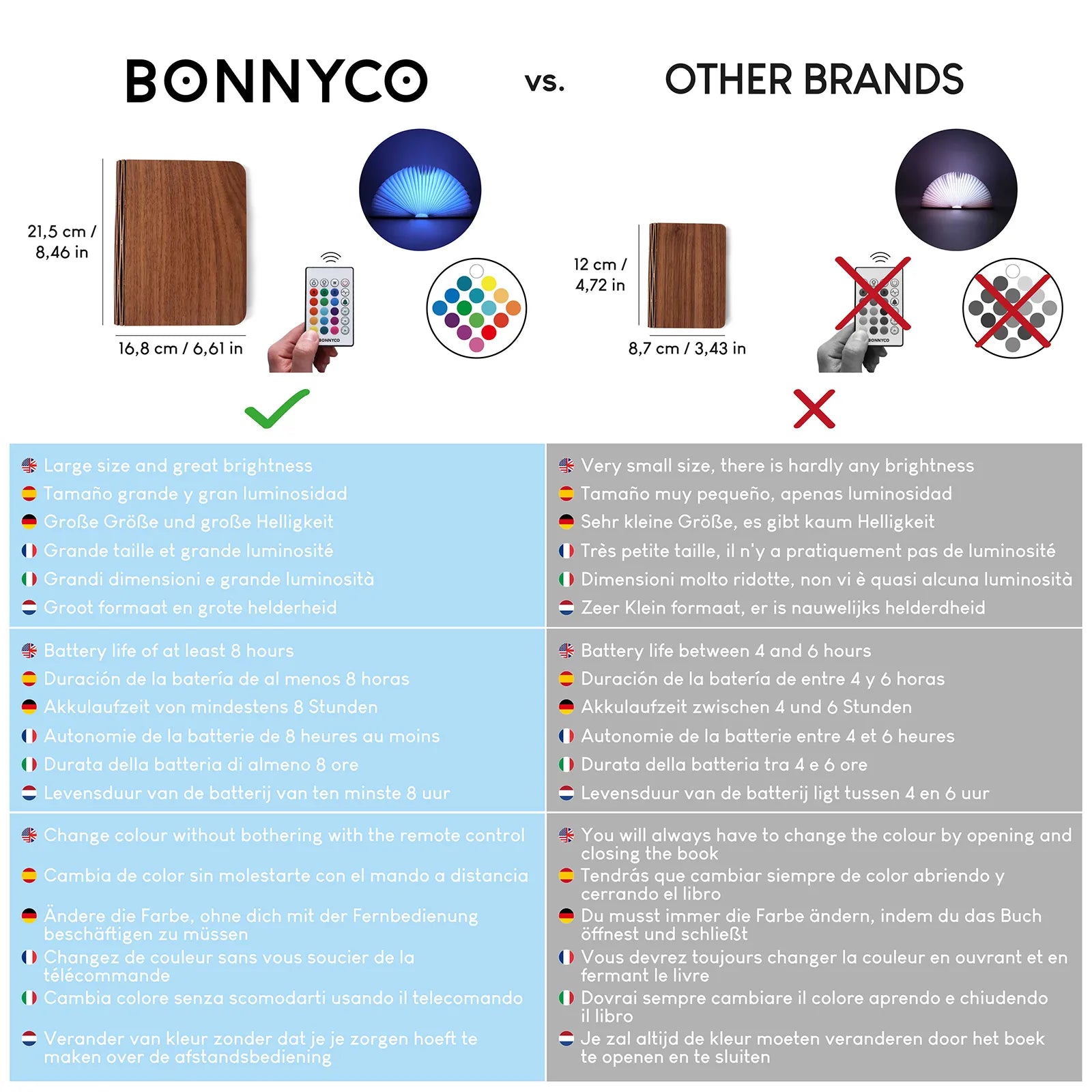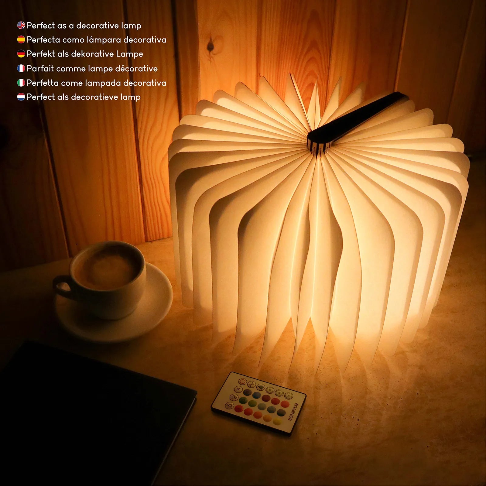Nuestra lámpara de libro tiene un funcionamiento sencillo e intuitivo. Ábrela para conectar la luz y ciérrala para apagarla o cambiar la luz de color. El mando permite elegir entre los 16 colores diferentes, ajustar la intensidad de la luz y seleccionar los diferentes programas incluidos. Su diseño robusto y flexible permite adoptar diferentes posiciones, con hasta 360 grados de abertura. Una vez plegado, puedes guardarlo como un libro más en una estantería o en un cajón. O dejarlo como parte de la decoración de una habitación.