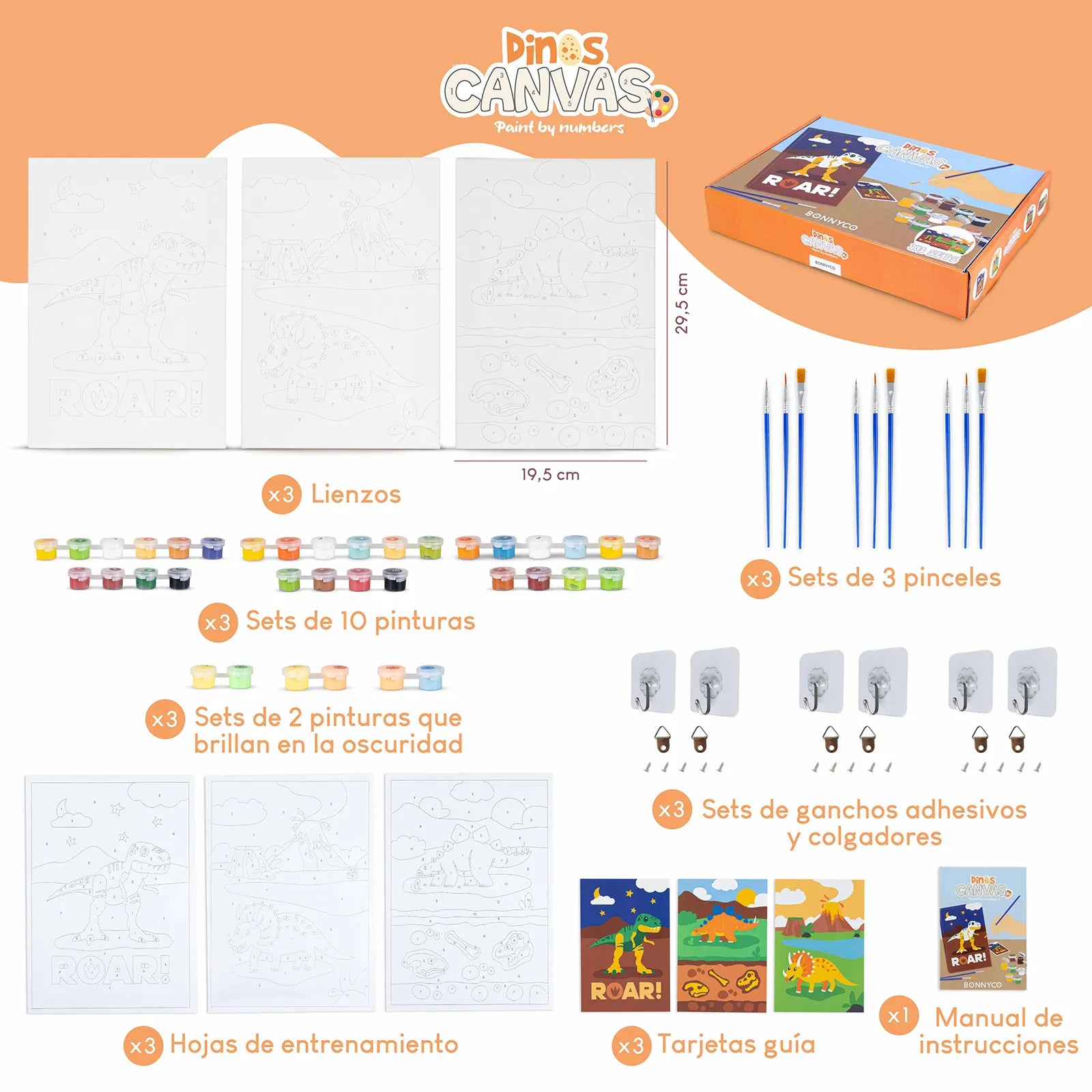 Pintar por números es un recurso guiado con el que los niños aprenderán a aplicar cada color en su sección correspondiente del lienzo de dinosaurios, una nueva experiencia que los mantendrá entretenidos durante horas a la vez que fomenta su creatividad, paciencia y concentración, el desarrollo cognitivo, la psicomotricidad fina y la precisión.