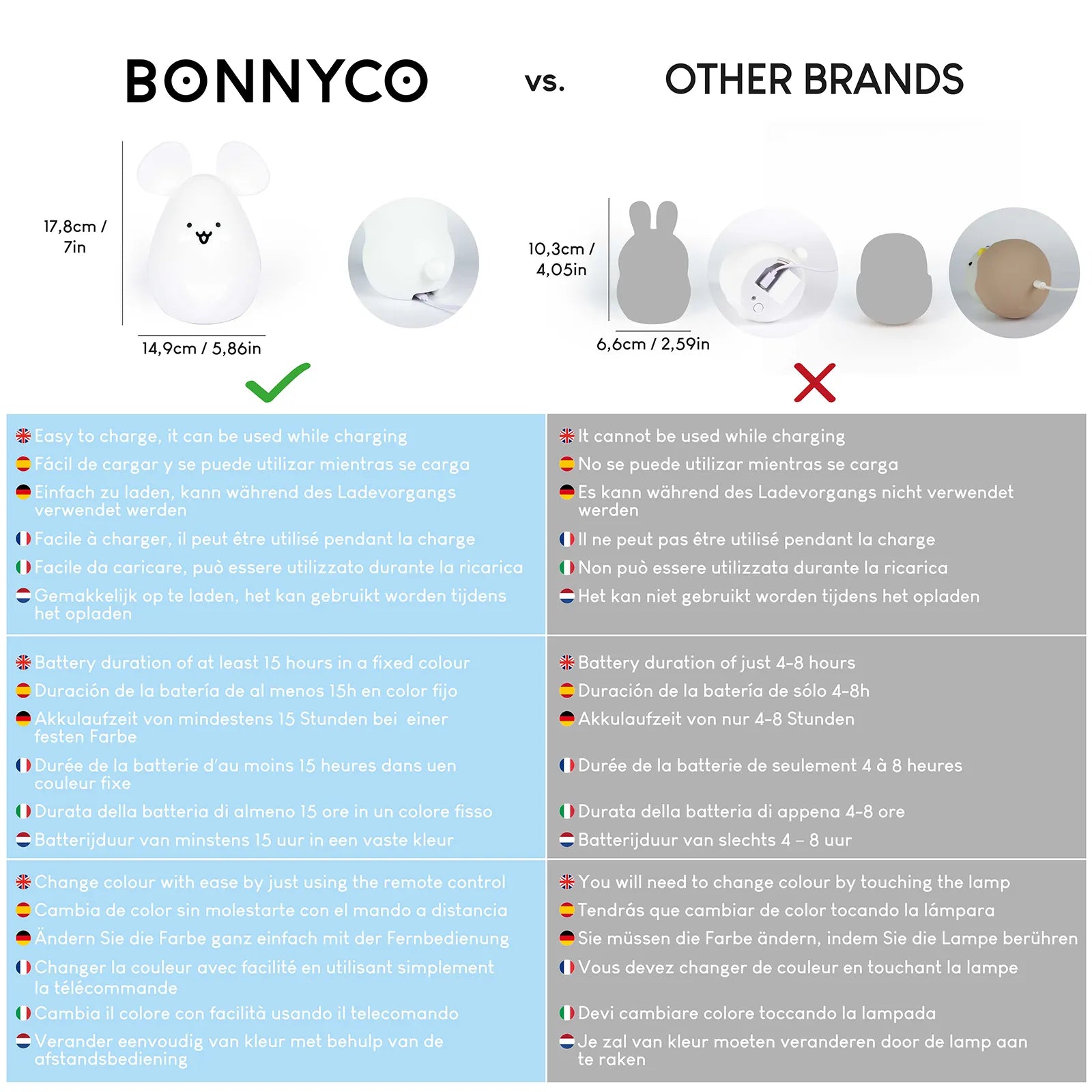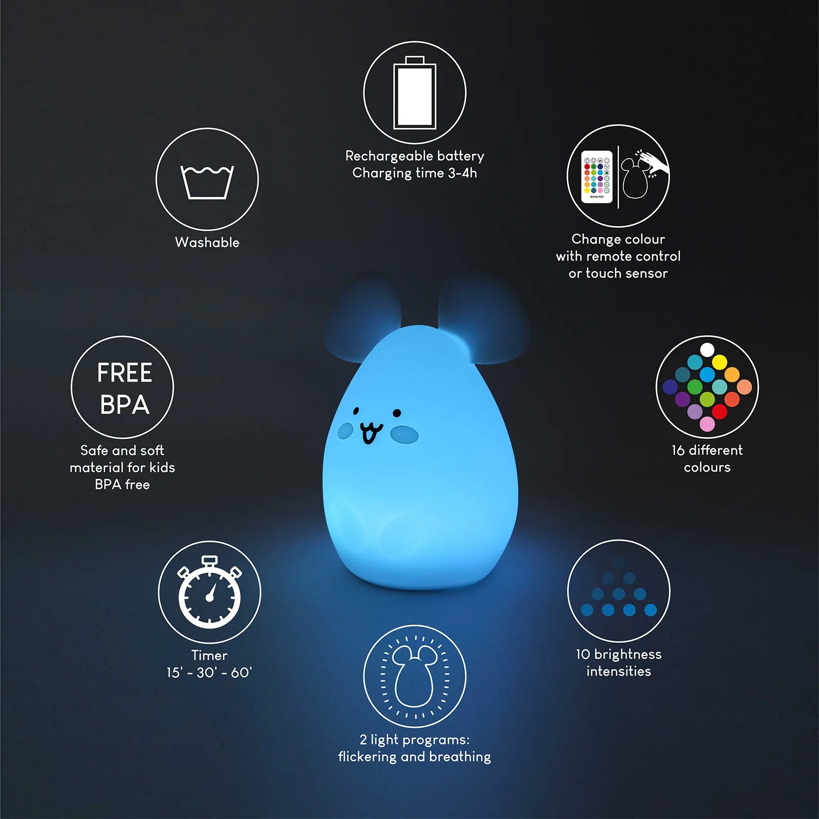 La lámpara quitamiedos infantil dispone de 16 colores de luz y 3 programas diferentes incluyendo un temporizador con apagado automático. Su sensor táctil hace que ajustarla se muy fácil e intuitivo, y el mando a distancia incluido te permite hacerlo desde cualquier punto de la habitación. Cuenta con una batería con hasta 15 horas de autonomía que se puede cargar con el cable USB (cargador de pared no incluido).