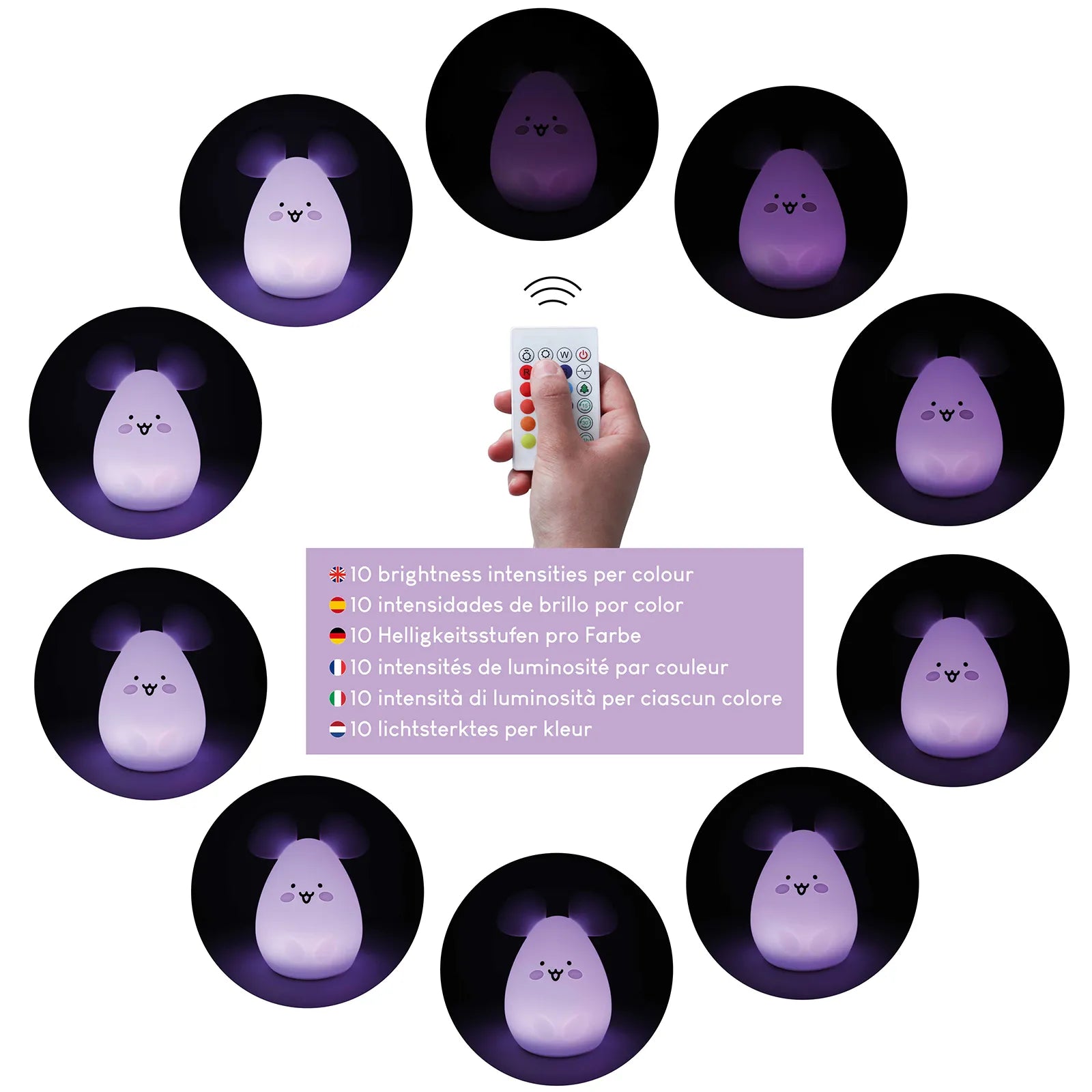 Nuestras luces nocturnas infantiles incluyen un sensor táctil que permite cambiar de blanco frío (color por defecto al encender la lámpara) a blanco frío intenso con el primer toque. Con el segundo toque pasará a modo difuminado de colores y con el tercero pasará a modo parpadeo. Con el cuarto toque se apaga la lámpara. El mando permite encender y apagar la luz quitamiedos, y ajustar tanto la intensidad como los programas de funcionamiento.