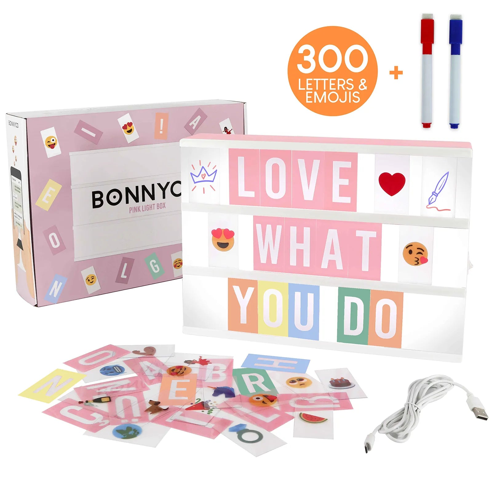 Nuestros carteles luminosos están equipados con iluminación LED y se pueden personalizar gracias a las más de 400 láminas incluidas con letras, números, signos y emoticonos. Funcionan con pilas (no incluidas) o con cable USB, y se pueden colocar sobre una superficie o colgarlas directamente de la pared. Una idea muy original como detalles de cumpleaños o regalos de Navidad.