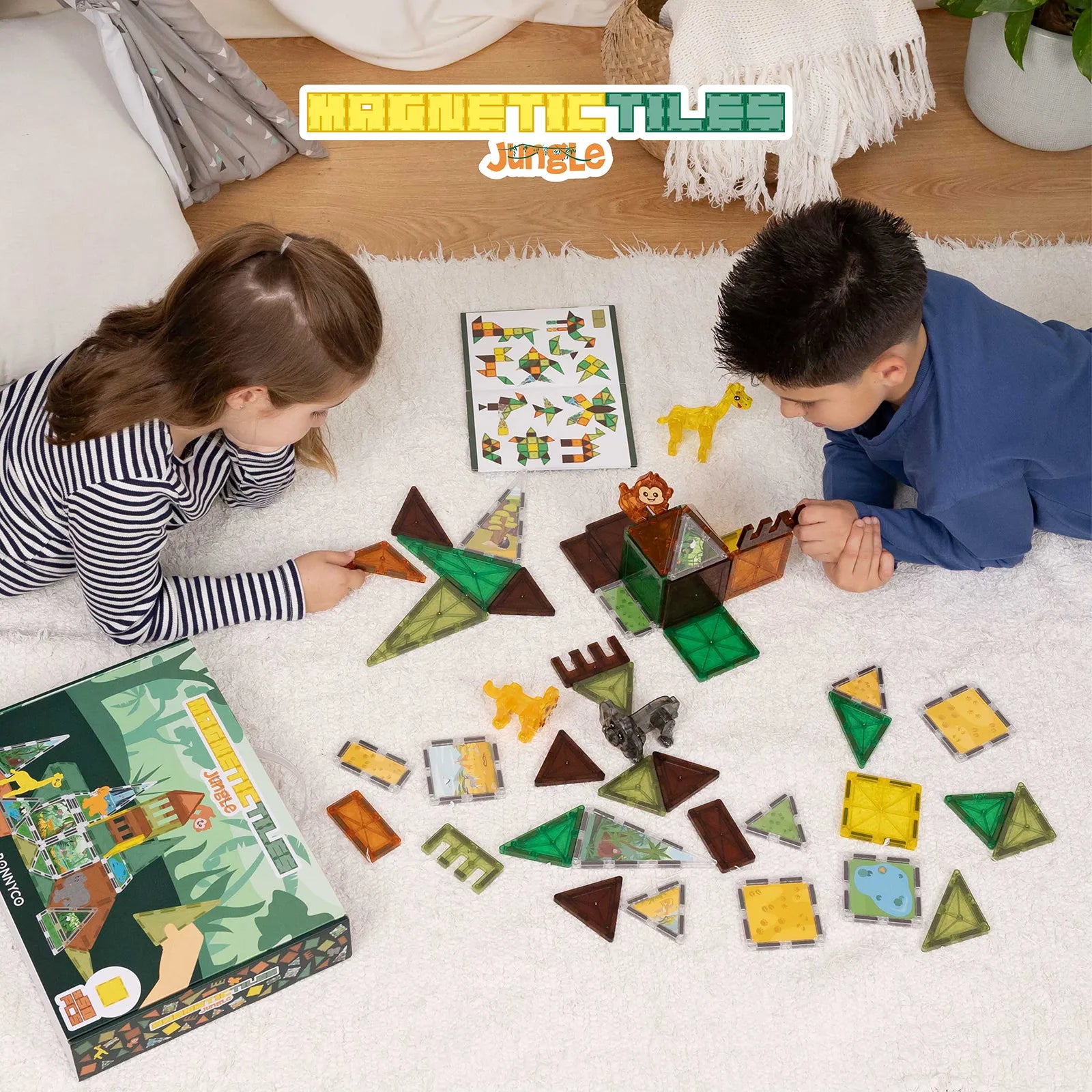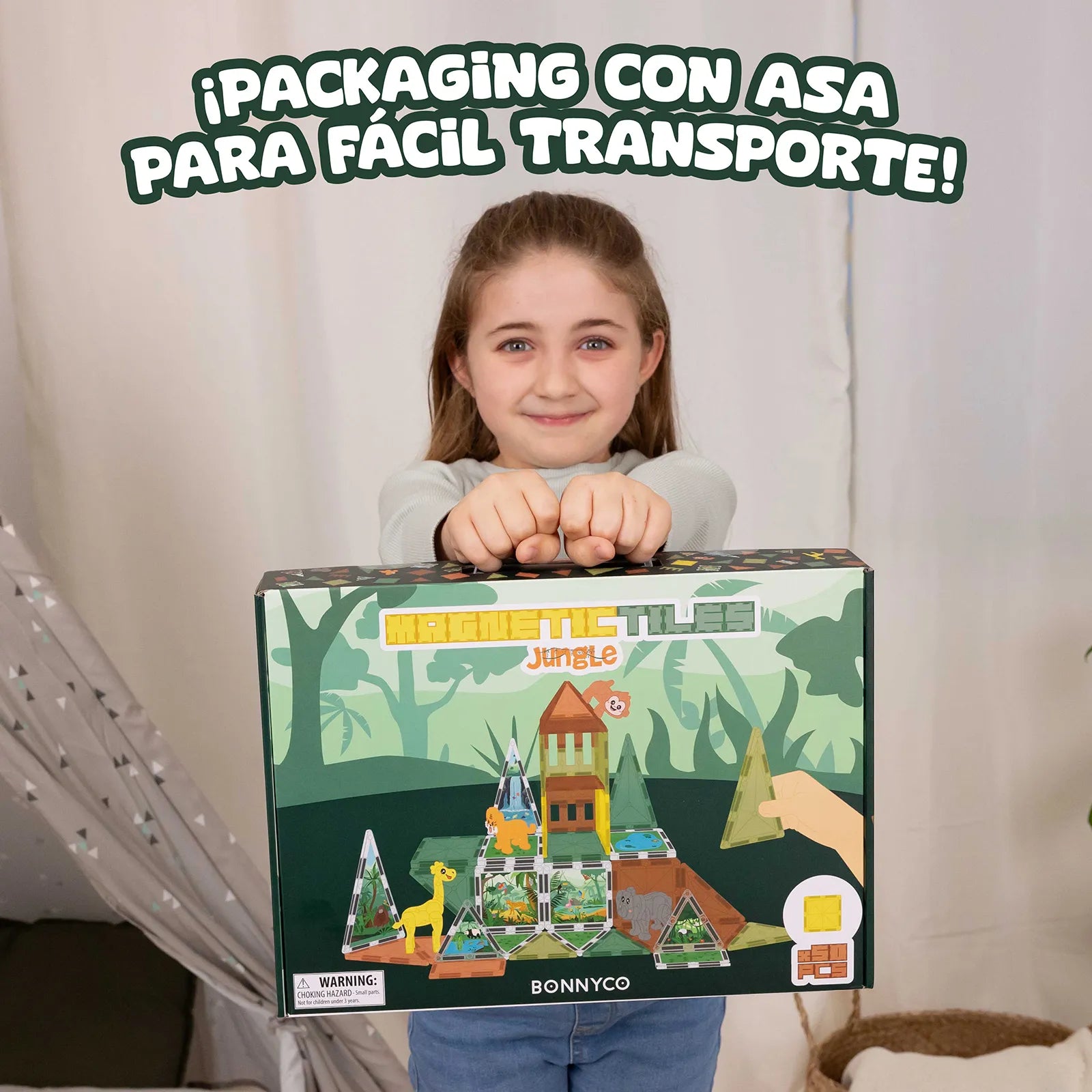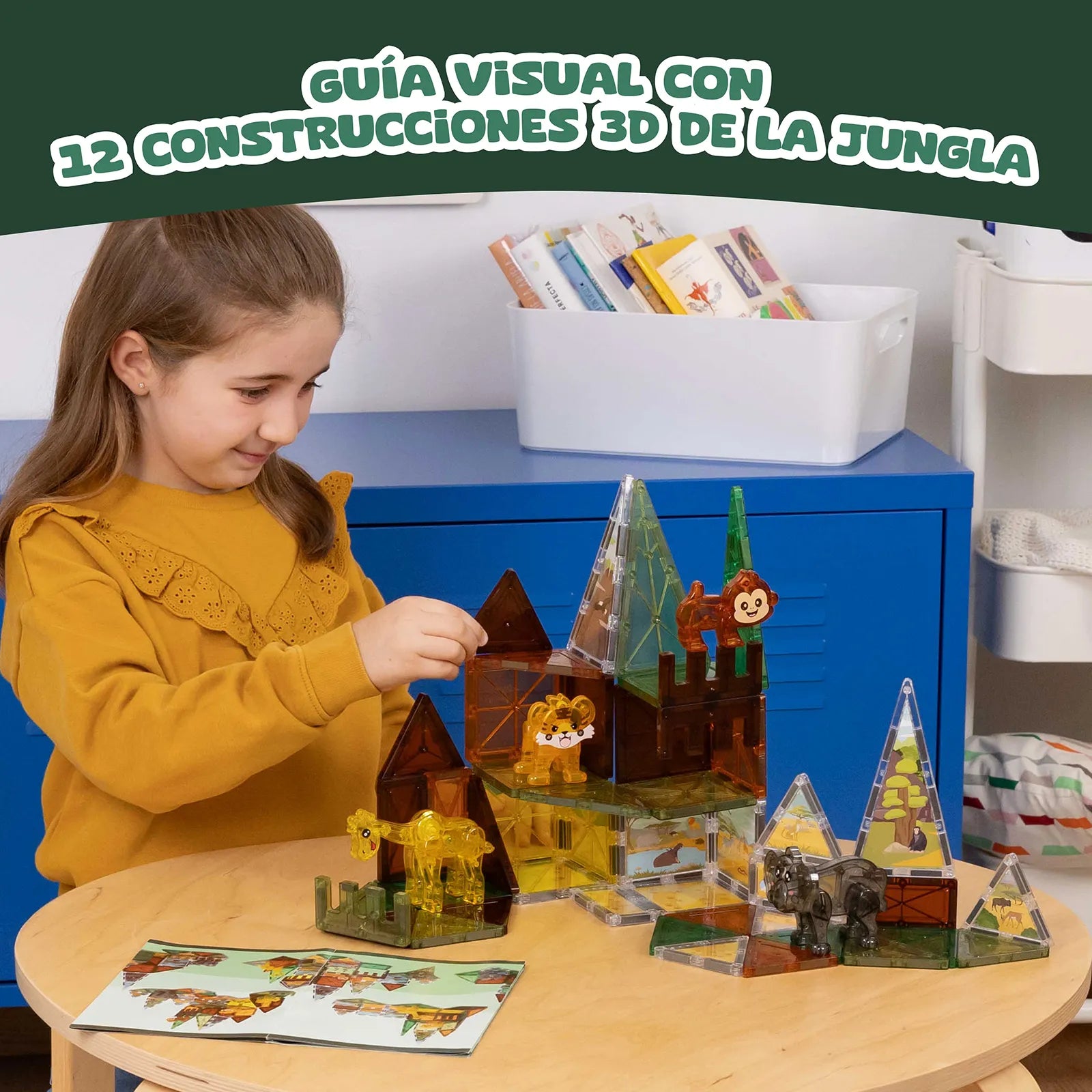 Inspirado en una jungla, Magnetic Tiles es un puzzle infantil con figuras de animales salvajes y numerosas piezas imantadas para dar forma a las creaciones de los niños. También incluye una guía visual en 2D y 3D como recurso de ayuda y un packaging para guardar las piezas cuando han terminado de jugar.
