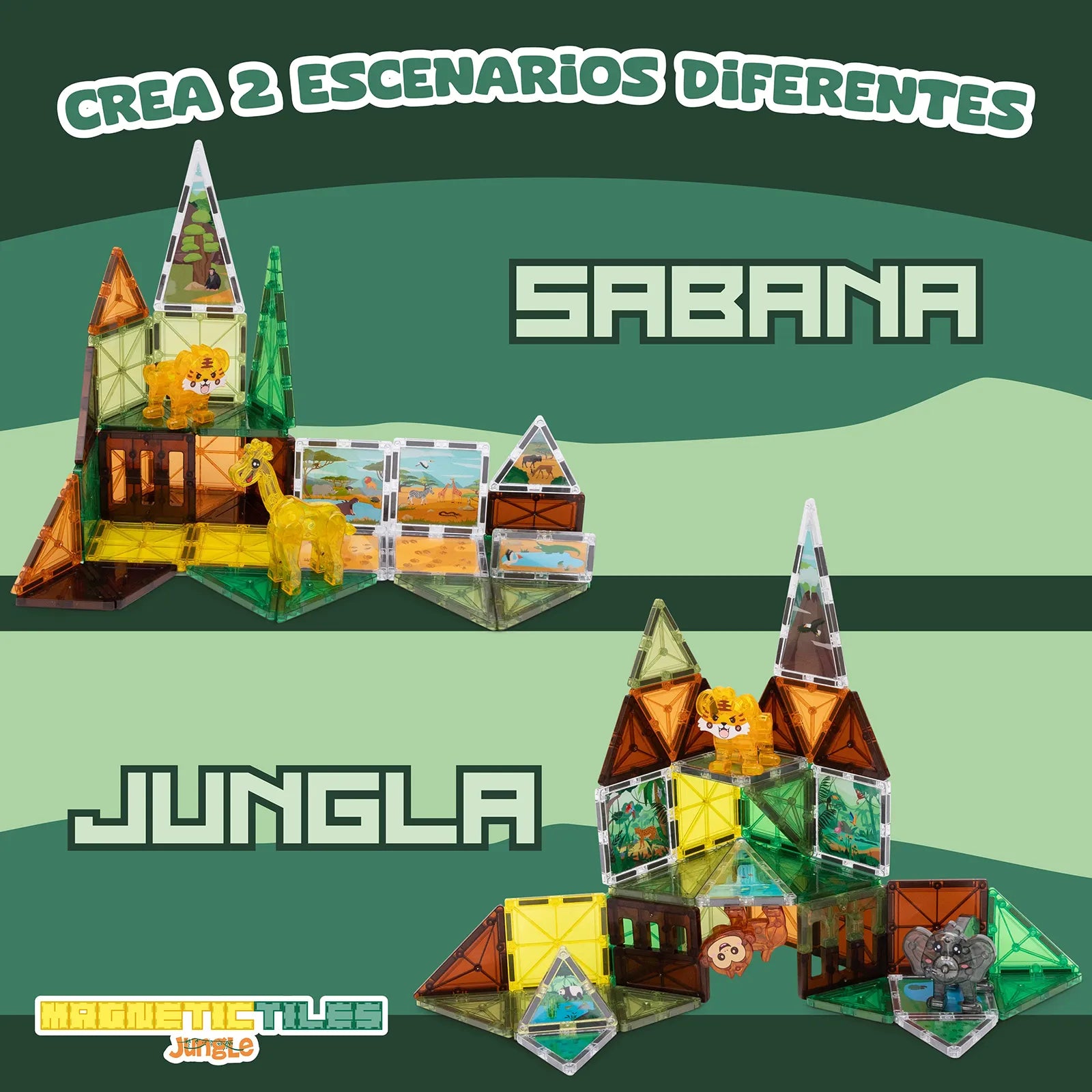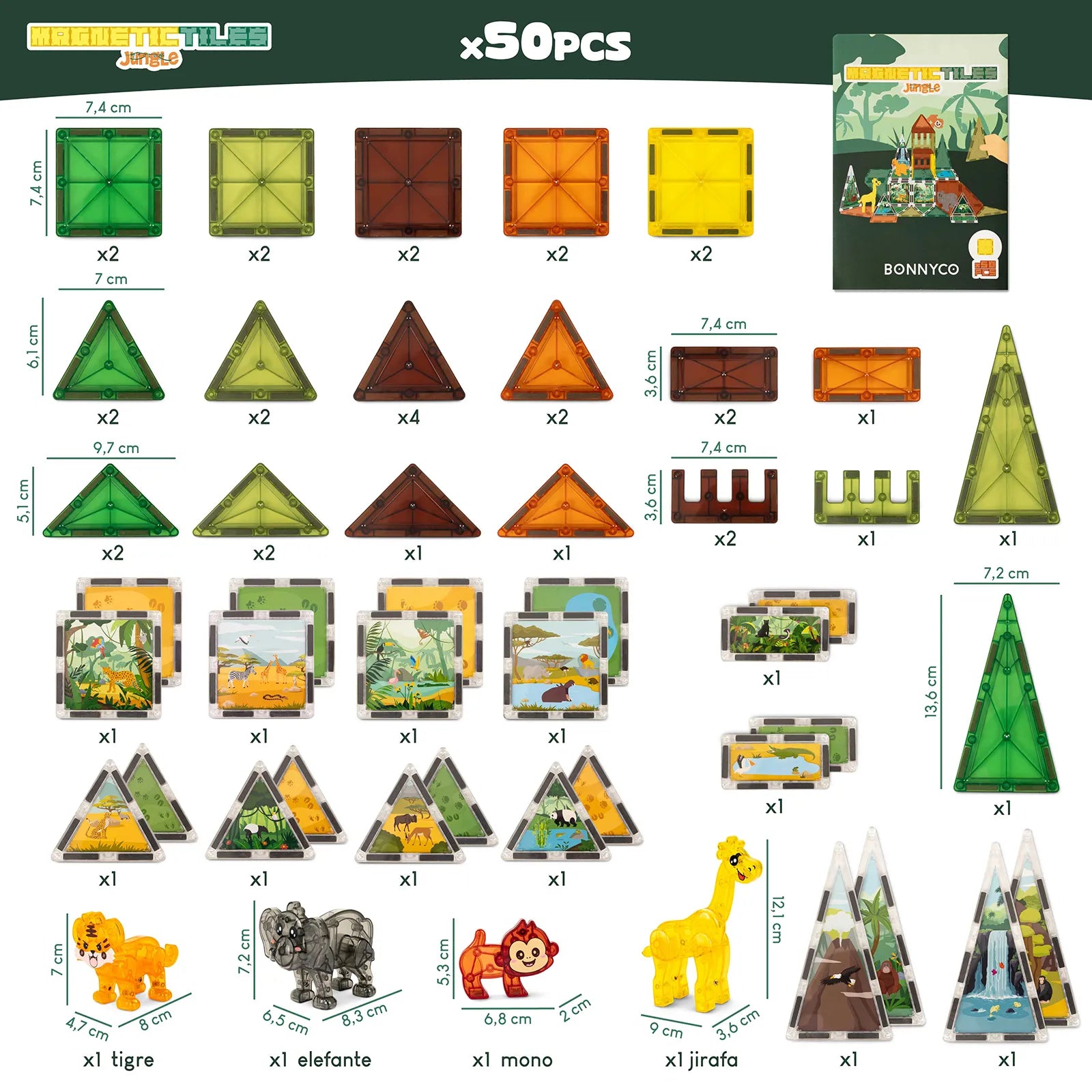 - 50 piezas magnéticas - Todas las piezas del kit están imantadas. Se dividen en piezas de color para construir, 12 con imágenes de animales en diferentes escenarios y 4 figuras de animales: