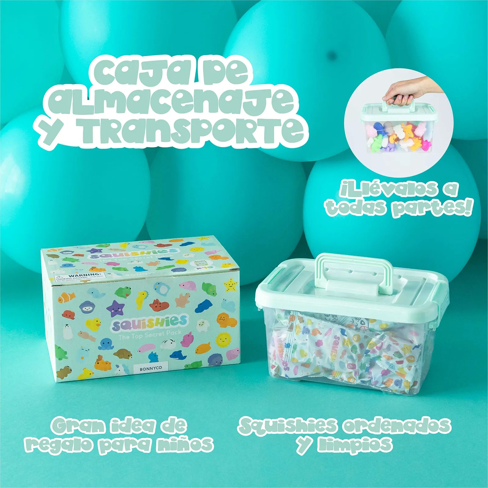 Nuestros squishies son ideales también como regalo para un niño o una niña. El pack incluye una caja con asa dura y resistente donde podrás guardar todos los squishy y llevarlos donde quieras cómodamente.
