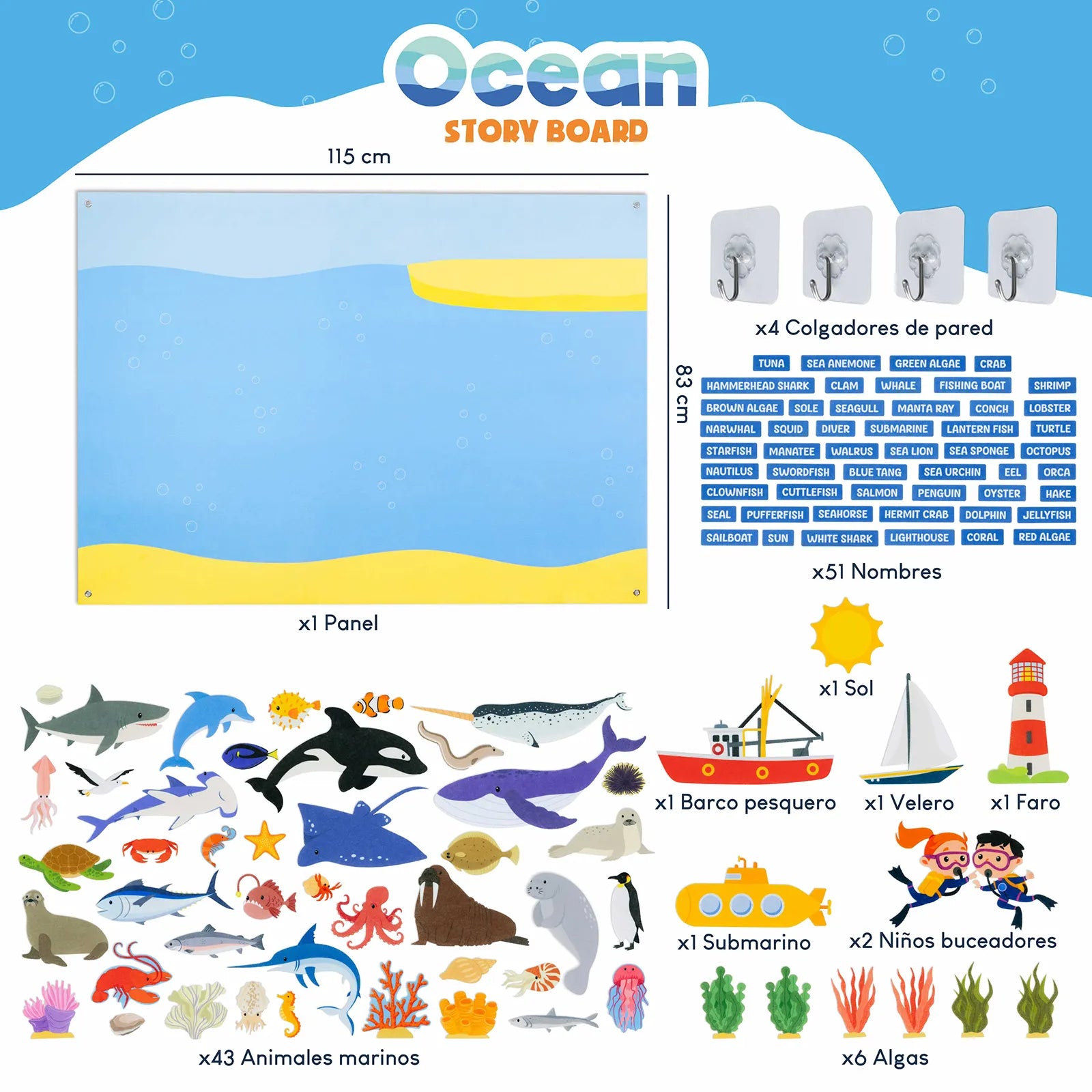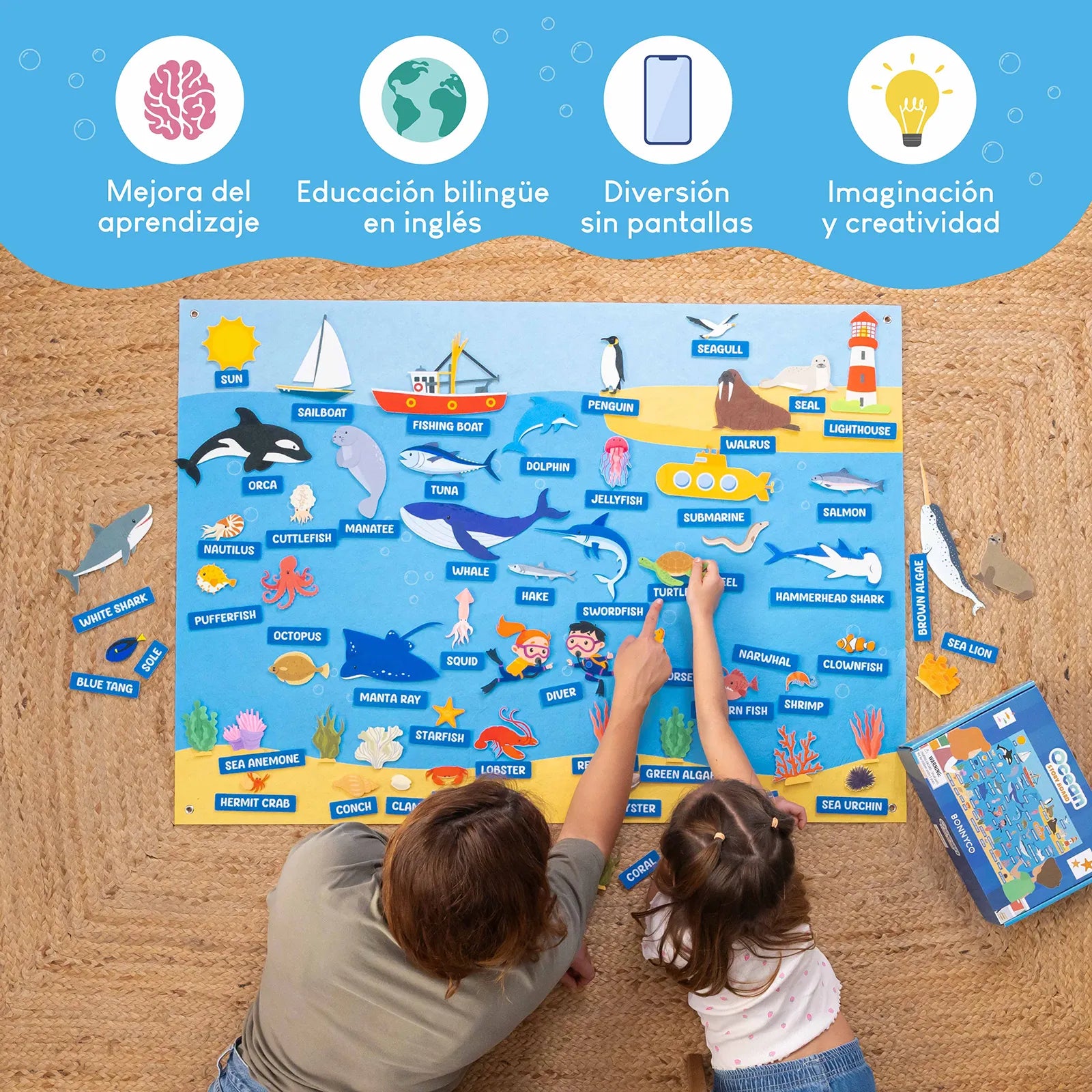 - Despliega el panel de fieltro. En él encontrarás el espacio suficiente donde colocar las 107 figuras con velcro para dar forma al océano.