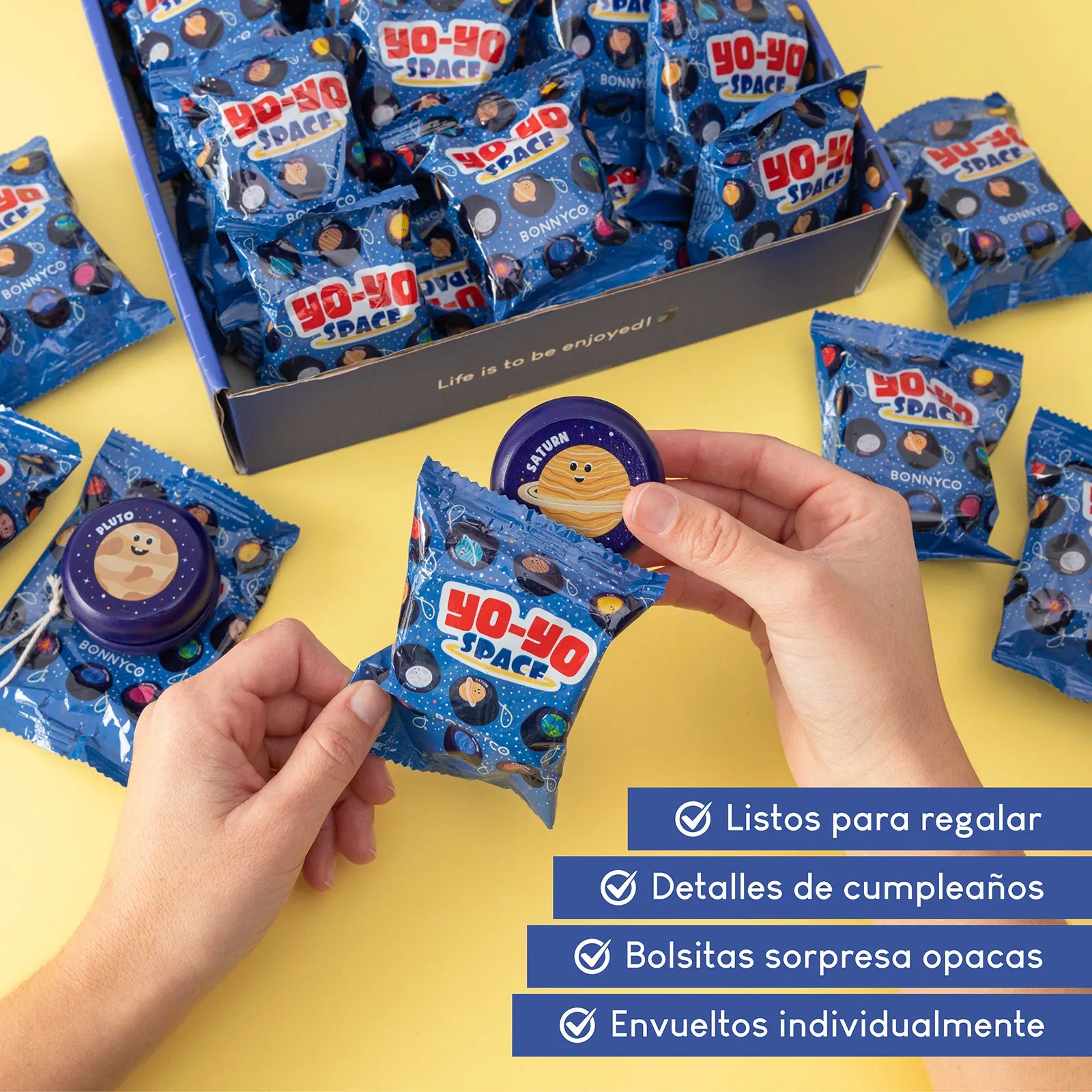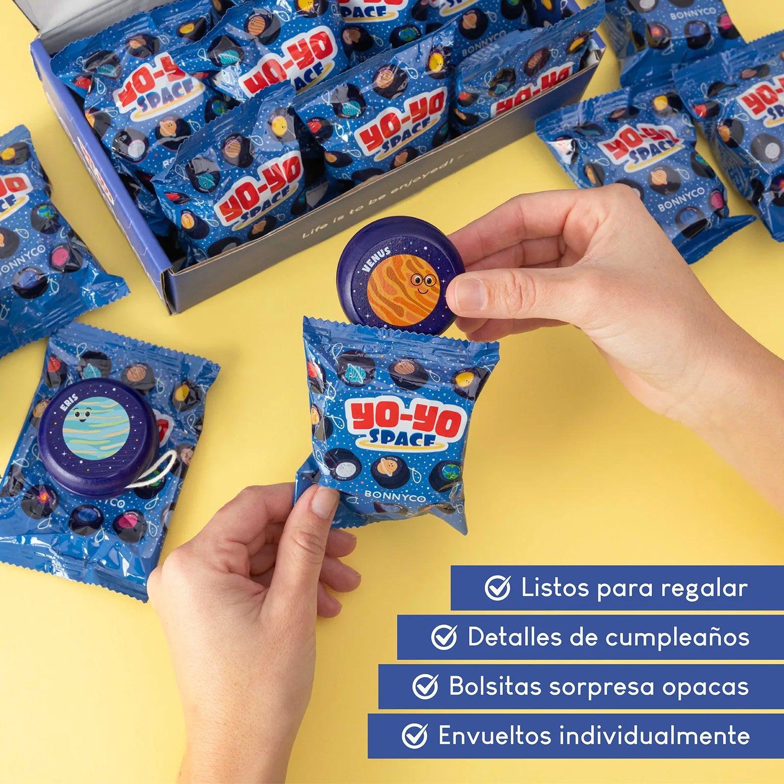 Cada yoyó viene en una bolsa opaca que mantendrá la sorpresa hasta el final. ¡Y ahorra tiempo envolviendo regalos!