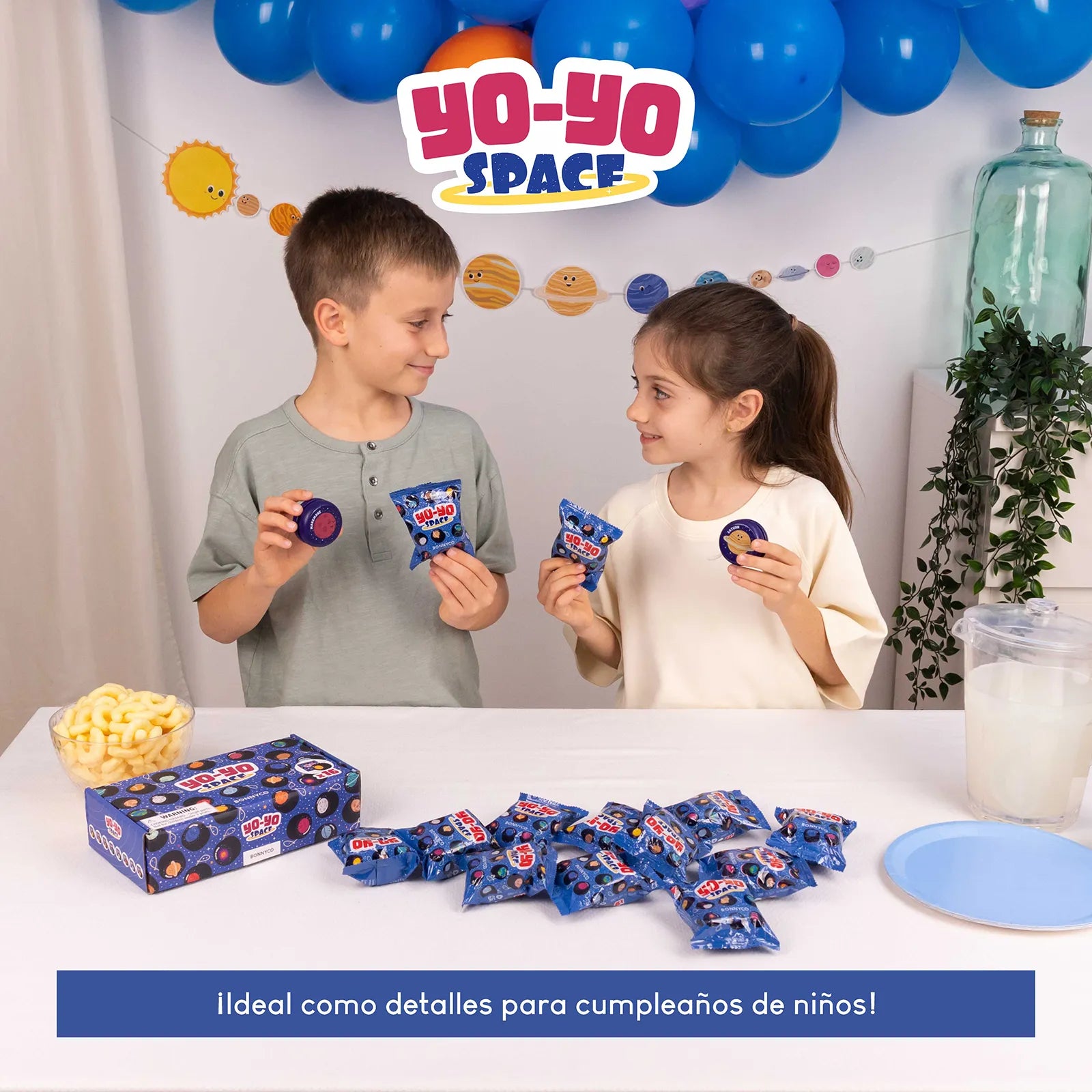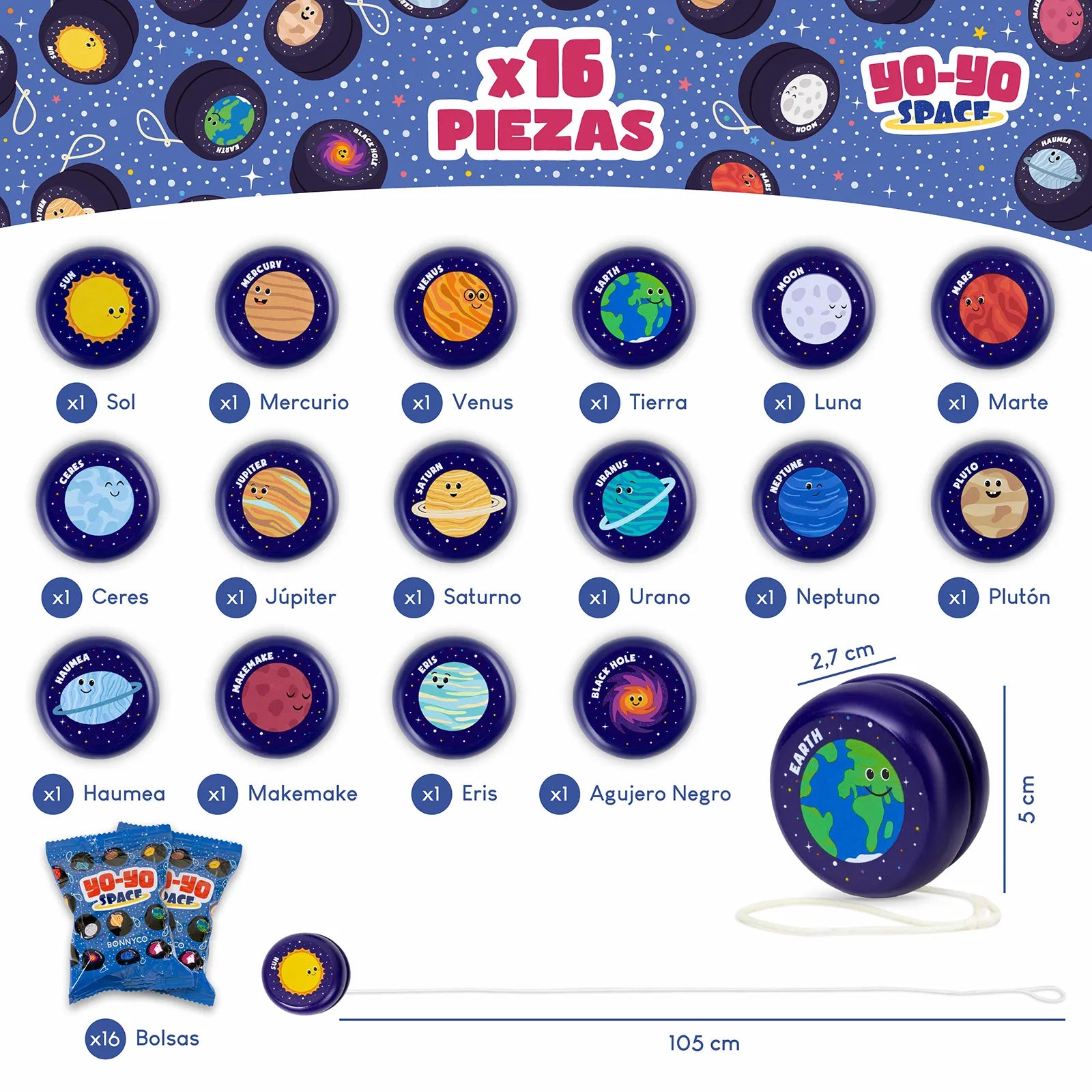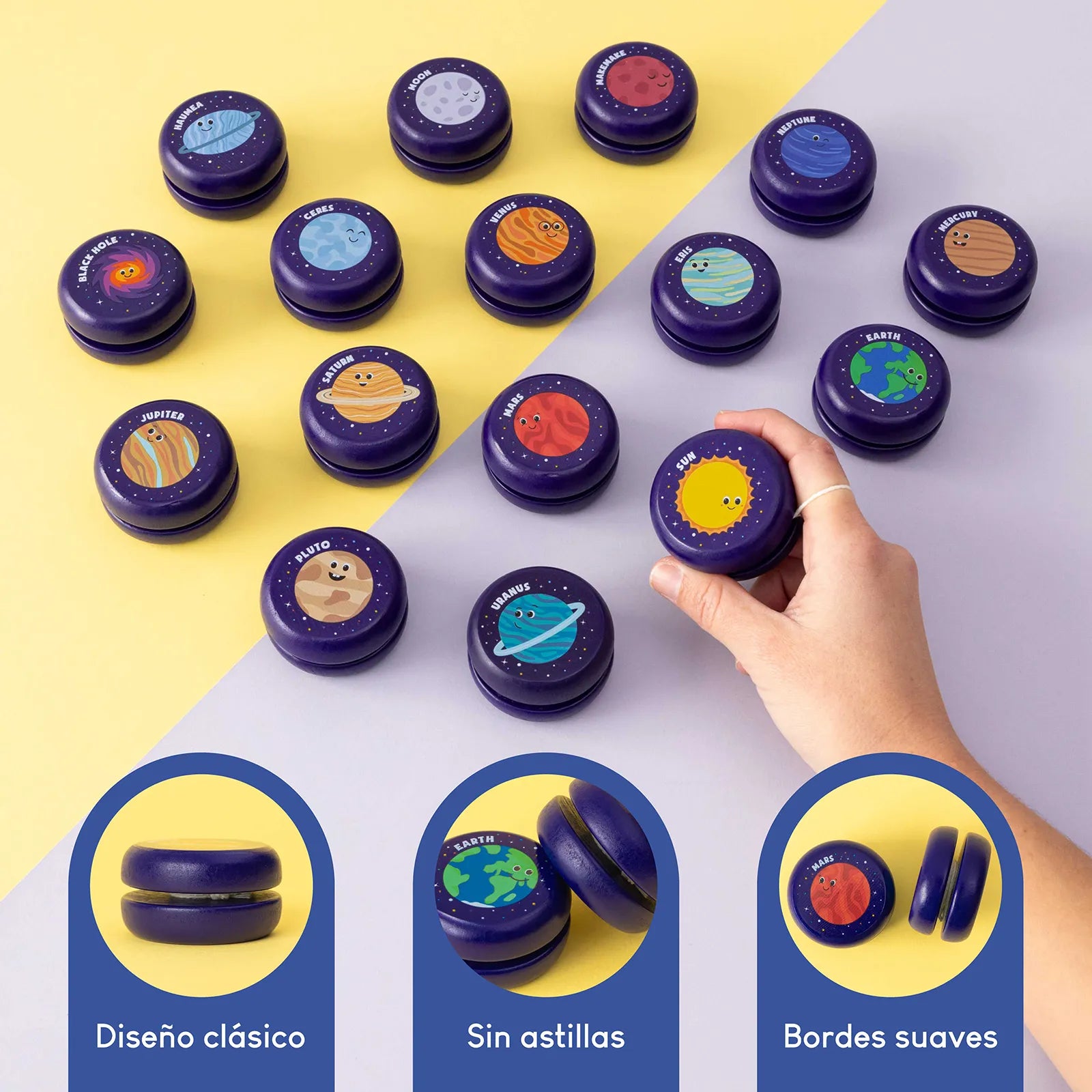 - 1 Yoyó de madera: un total de 16 o 32 yoyós de madera con dibujos del sistema solar. Entre ellos encontrarás el Sol, la Luna, los planetas principales: Mercurio, Venus, Tierra, Marte, Júpiter, Saturno, Urano, Neptuno; los planetas enanos: Ceres, Plutón, Haumea, Makemake, Eris; y objetos del espacio como el agujero negro. En el pack de 16 detalles no hay duplicados, cada peonza tiene un diseño diferente. En el pack de 32 detalles los diseños se repiten dos veces. Una gran variedad de yoyós de colores con los que no pararán de jugar durante horas