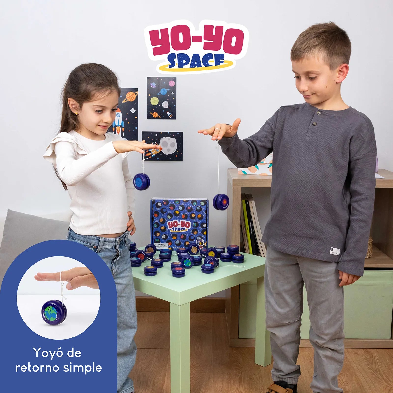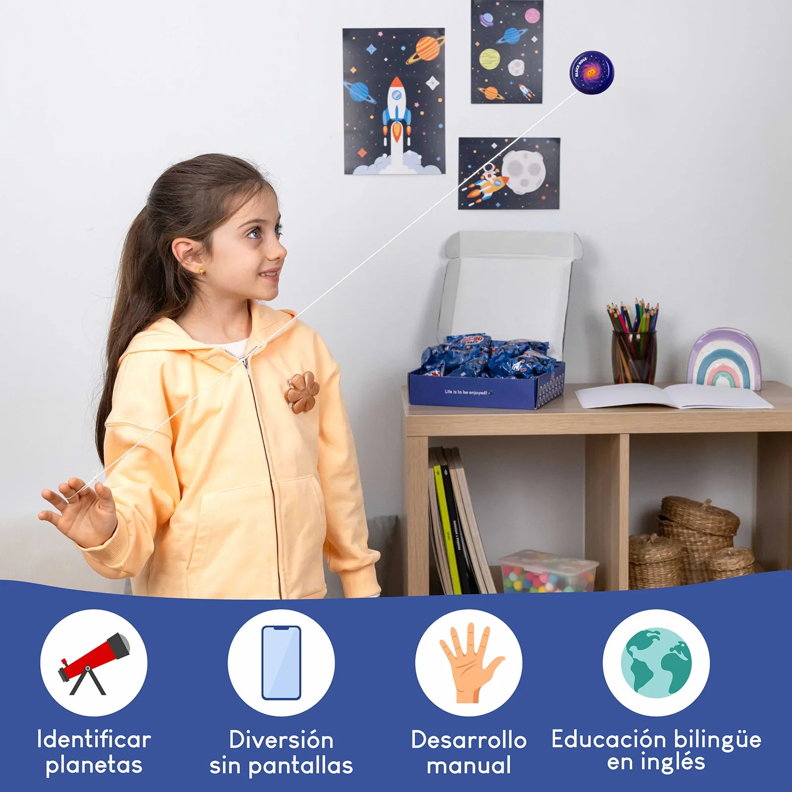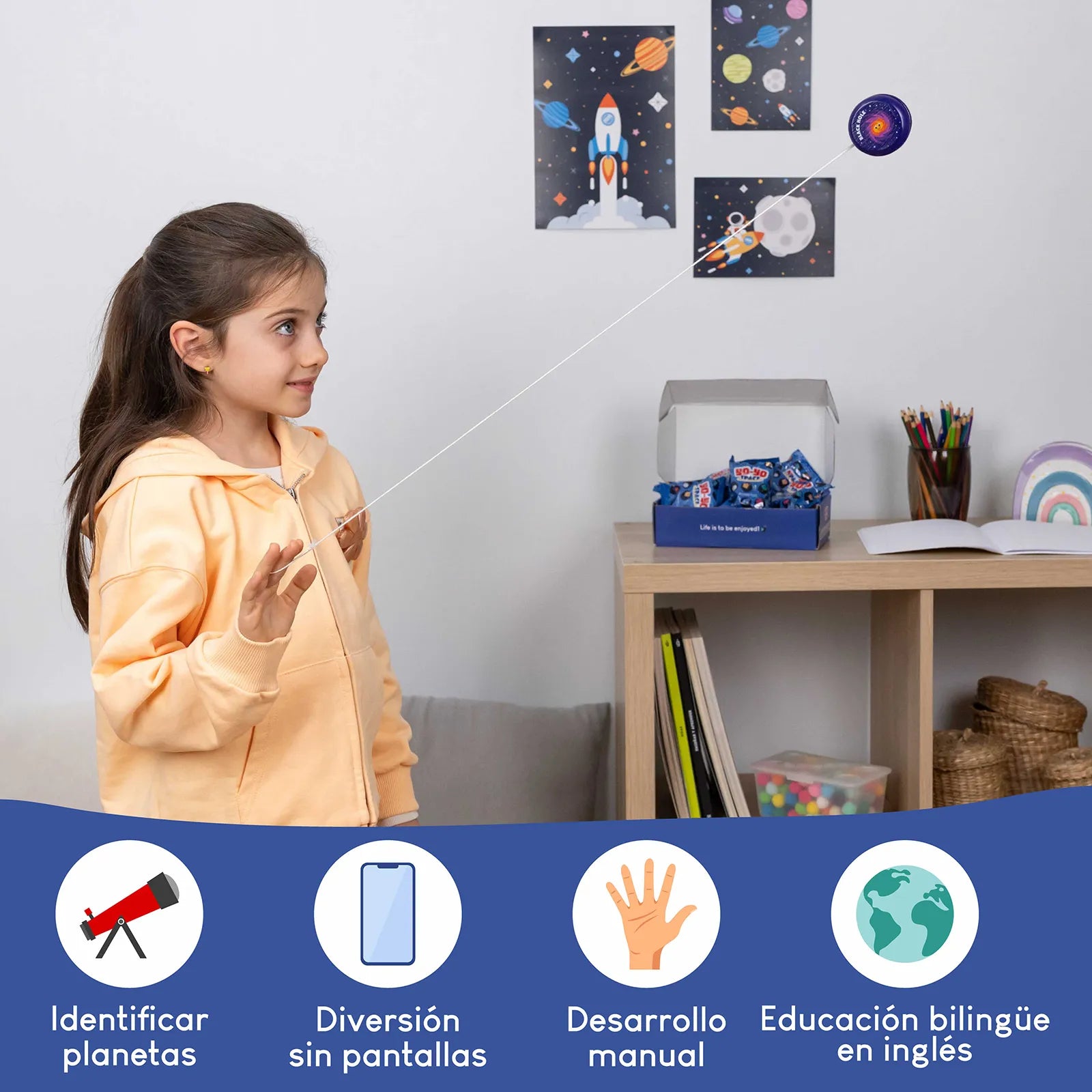 Nuestros yoyós de madera de gran calidad están fabricados con materiales suaves adaptados a las manos de los niños. Sus diseños del sistema solar y su forma permiten a los niños desarrollar su motricidad fina, la coordinación mano-ojo, la destreza manual y la coordinación. Además, es un recurso ideal para mantenerlos alejados de las pantallas.